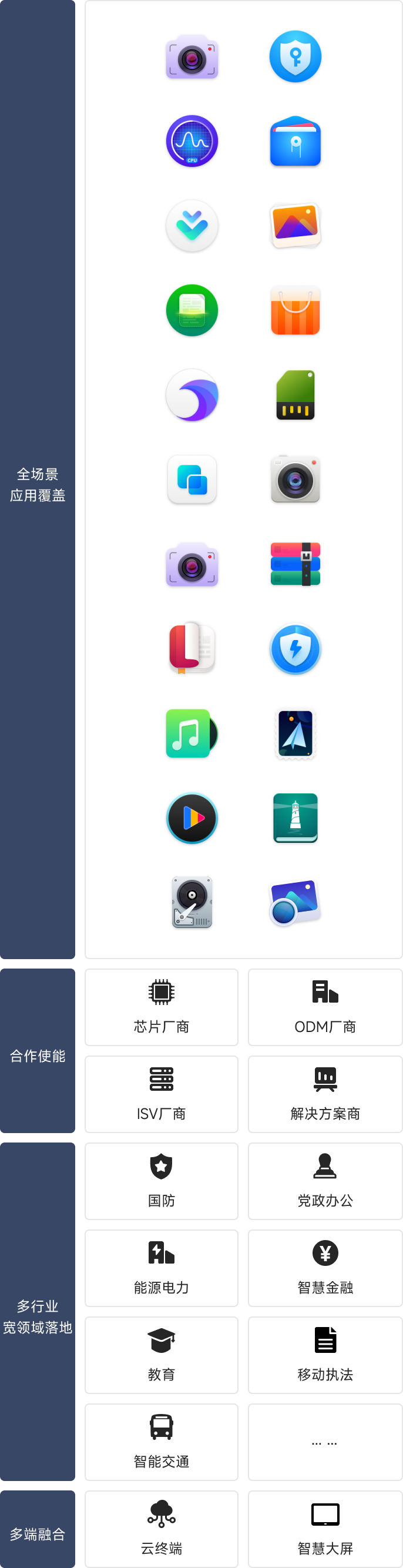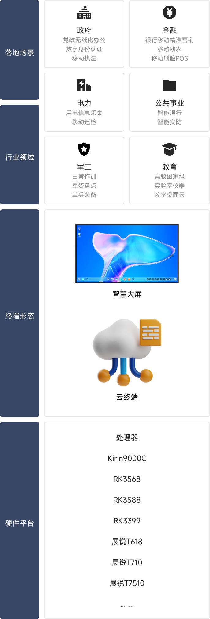 统信智能终端操作系统专业版是一款专为智能终端打造的多端融合操作系统,基于Linux内核自主研发,确保多维度安全防护,实现了对Linux Qt应用和Android 应用的兼容,可在平板电脑、手持终端、智慧大屏、自助终端和云终端等不同形态的智能终端设备上部署,满足党政军以及金融、电力、能源、教育等关键行业的各类业务及使用场景需求。