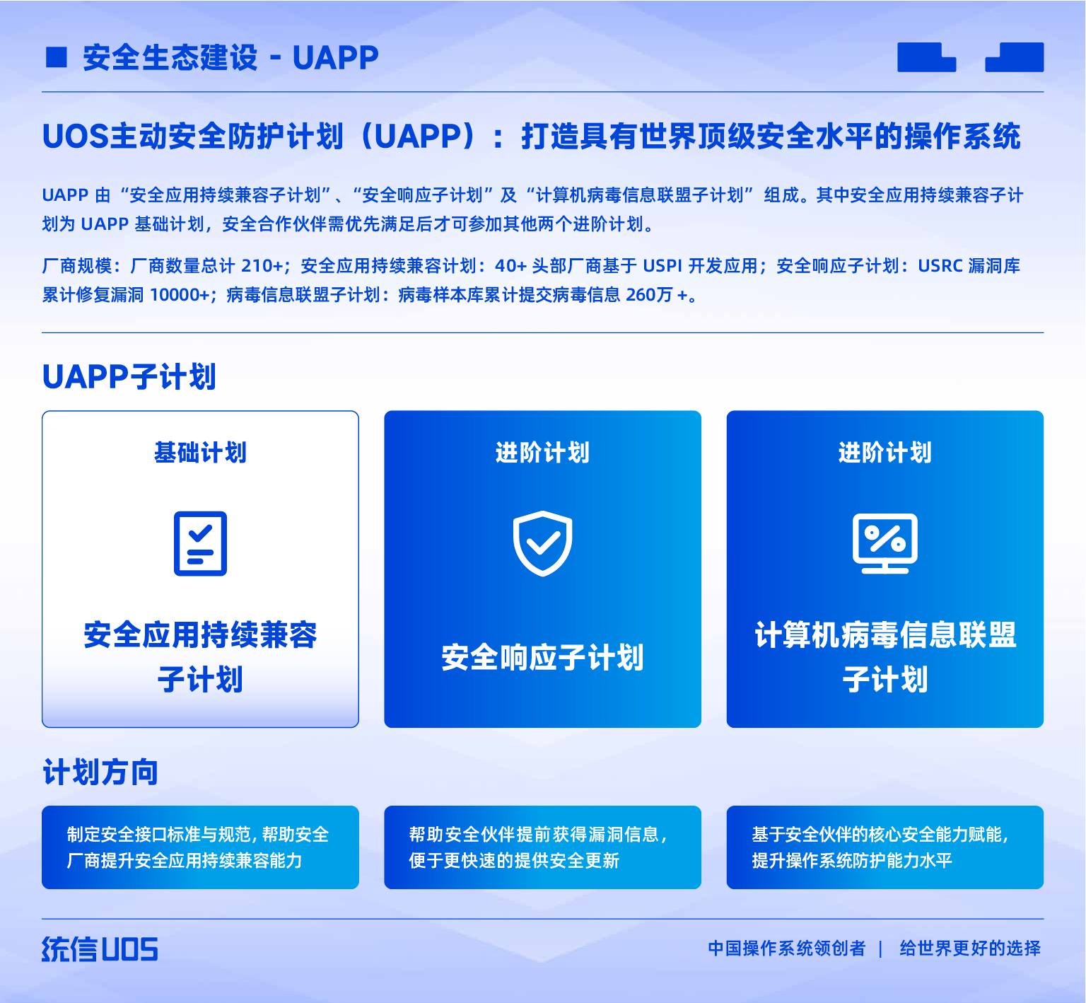 - 统信软件呼吁国内安全厂商踊跃加入 UAPP 计划,打破传统孤立运作模式,共建跨企业、跨领域的“联动防御”生态。通过协同机制实现能力互补、信息共享与联合响应,不断提升我国整体网络安全防护水位。