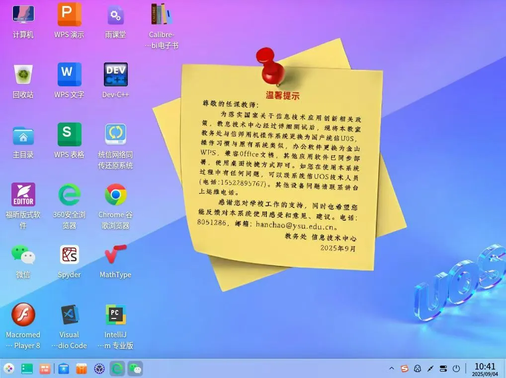 自 9 月 1 日开学起,首批完成改造的 304 间搭载统信 UOS 的信创多媒体教室已正式投入教学使用。在学校精心组织和统筹下,校方运维保障团队与统信软件技术支持团队紧密协作,确保了所有教室在整个开学期间运行稳定、操作流畅,实现了“零故障、零中断”的优异表现,未发生一例因系统切换而影响教学的事件。全新的教学环境体验获得了教务处、授课教师及广大学生的普遍认可和高度评价。
