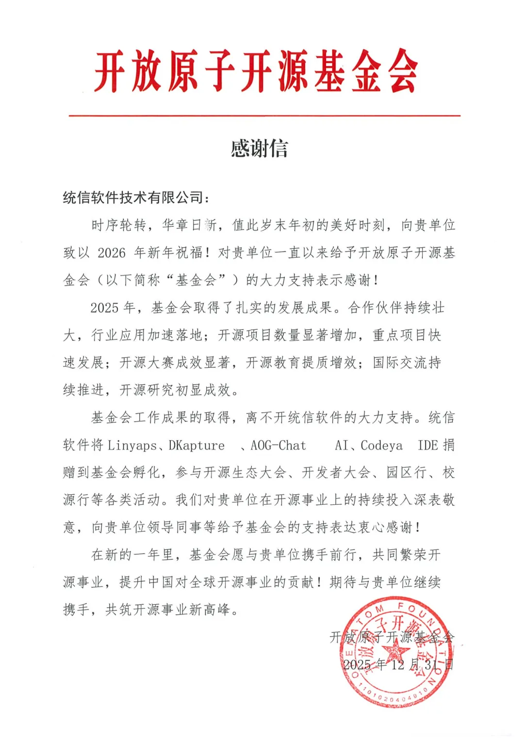 一次次支撑,一封封谢函,共同勾勒出统信软件在技术研发、开源贡献、产业协同等多维度的扎实贡献与鲜明形象。统信软件将继续以开放之心联结生态,以专业之力赋能产业,与众多伙伴一道,在信息技术自主创新的征途上,携手书写下一章辉煌。