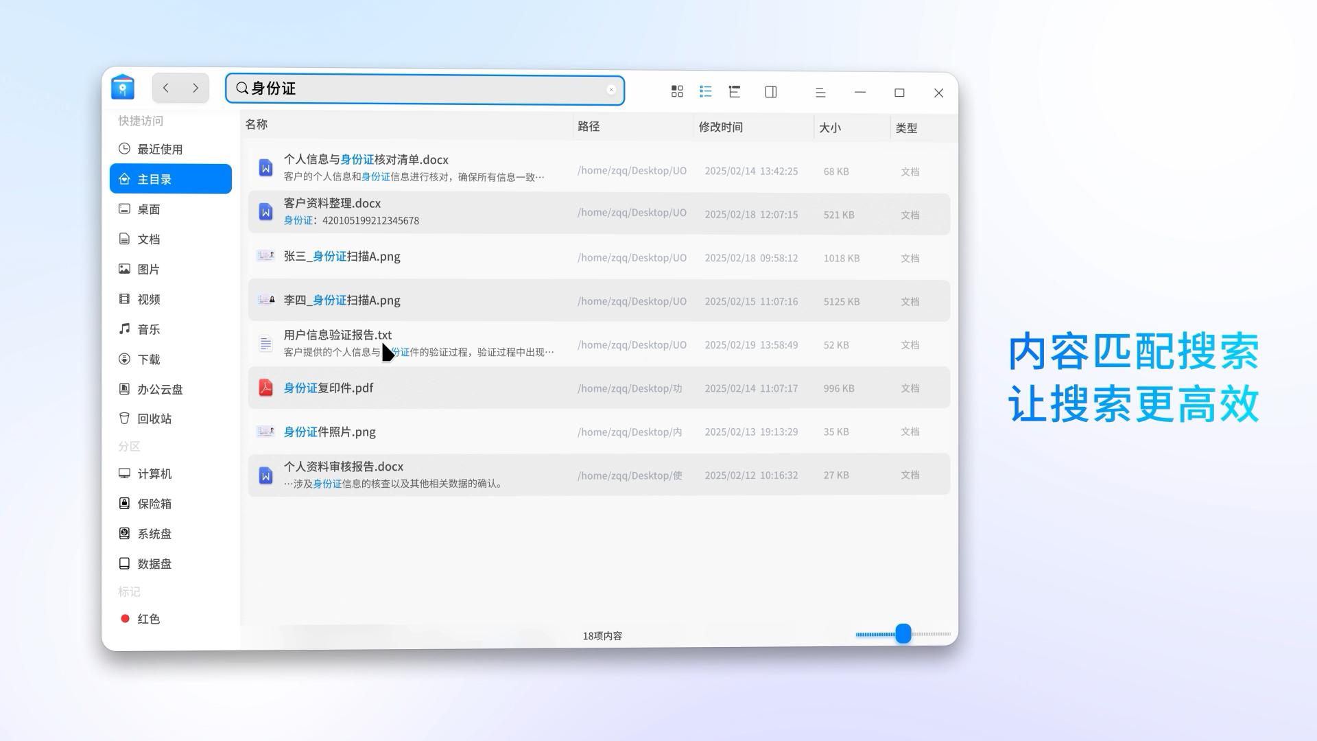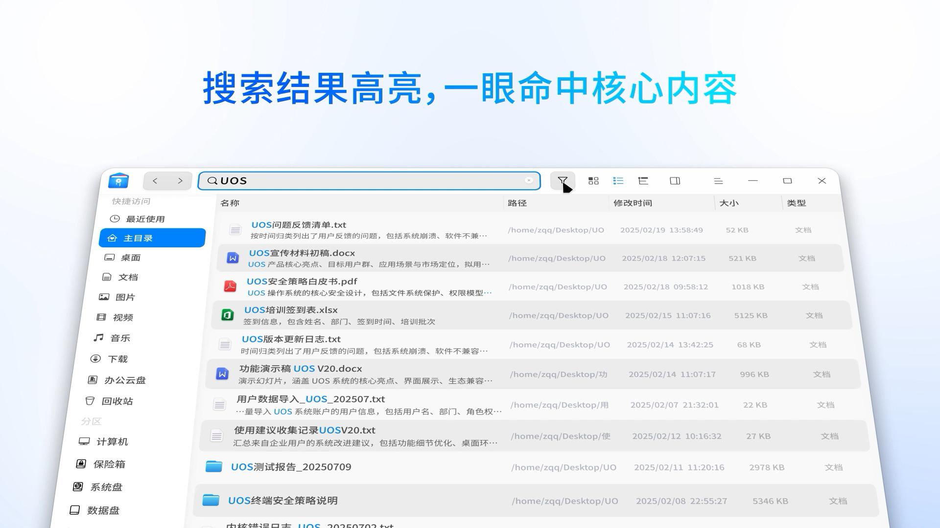 找到文件只是第一步,快速定位关键内容才是提升效率的核心。统信桌面操作系统 V20 的全文检索结果,会对文件名和文件内容中的关键词进行高亮标注,无需逐字阅读就能一眼锁定重点。