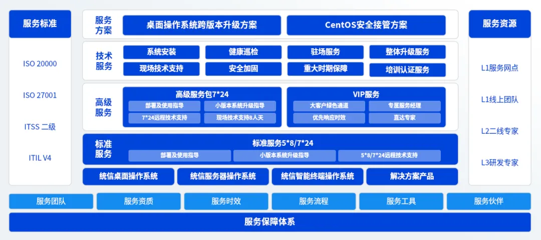 统信软件始终秉承以“以客户为本”的服务理念,通过科学、完善的服务流程体系,为用户提供标准化、规范化、专业化的技术服务支持,打造优质服务口碑。已在全国七大区域服务中心设立 31 个省级服务点、70+ 授权服务中心、万人级认证工程师,为用户提供 7*24 小时全方位、及时性的技术服务与支持。同时打造了统信“有助”专业服务品牌,致力于提供全方位、高效、稳定的技术支持与解决方案,为千行百业实现数智化转型与价值创新保驾护航。凭借领先的技术能力、完善的方案能力和优质的服务能力,目前统信软件已服务客户超过 50000 家。