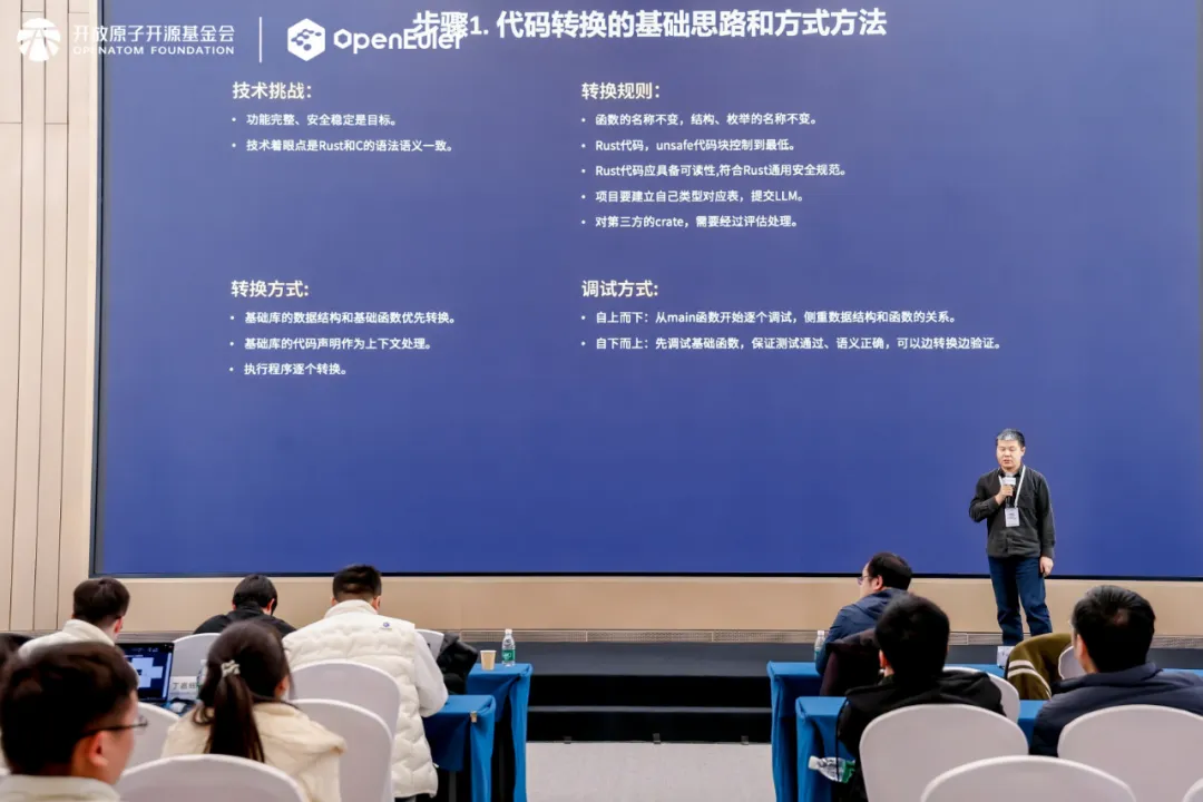 在“开发者使能与工具”分论坛,统信软件研发经理张海东分享了《C 语言转换 Rust 语言的 AI 自动化方法》: