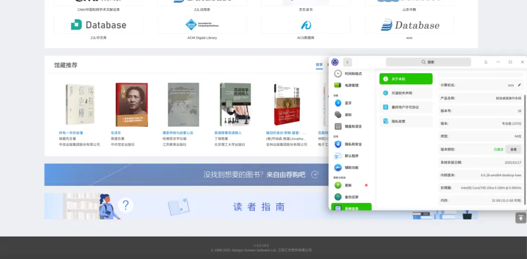 统信 UOS 支持 AMD、ARM、龙芯 LoongArch 等 CPU 架构,新一代图书馆平台系统在此基础上实现了软件层面的全面兼容,此次适配融合了统信 UOS 的安全稳定特性与新一代图书馆服务平台的专业服务能力,为图书馆行业提供了一套全链路自主可控、稳定高效的国产化解决方案。