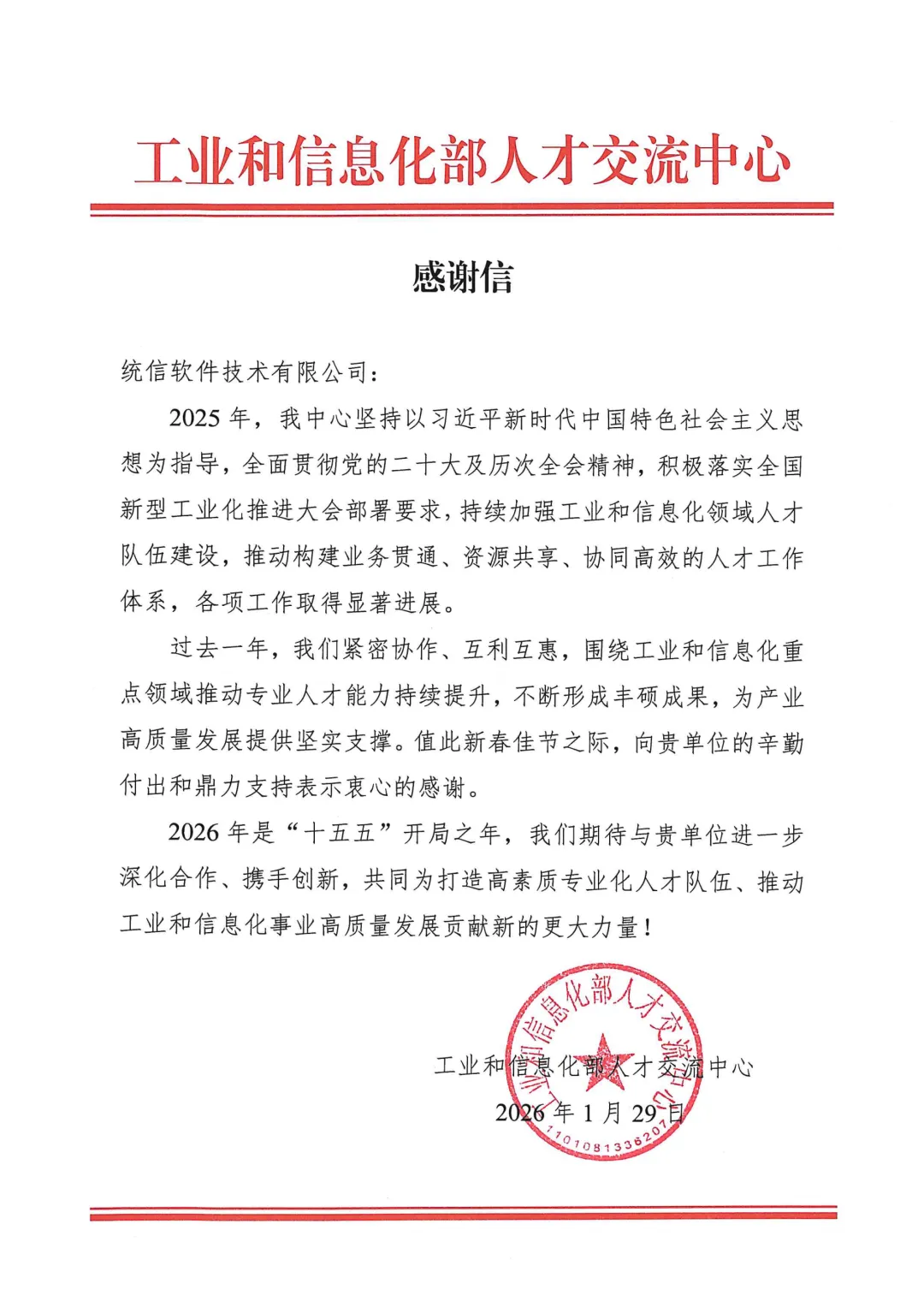 值此岁末之际,统信软件欣喜收悉工业和信息化部人才交流中心发来的感谢信。