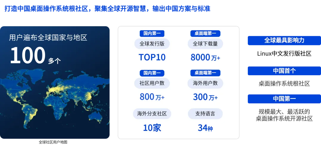 先进的创新模式,根植于全球开源生态的协同进化。统信软件拥有国内首个具备全球影响力的桌面操作系统根社区 deepin,用户遍布全球 100 多个国家,吸引全球开发者贡献,形成“社区驱动-商业产品-反哺社区”的良性循环,让统信 UOS 始终站在全球技术前沿,确保产品不“掉队”。