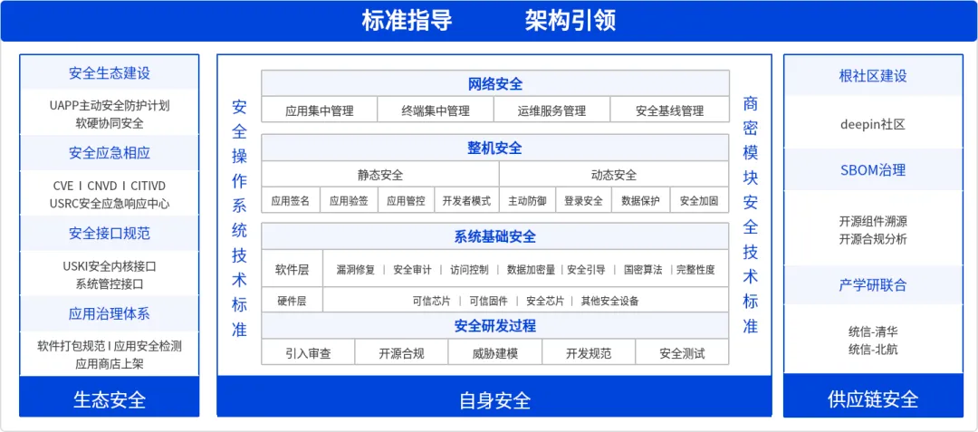 统信 UOS 安全体系架构基于分层分类理论,从自身安全、生态安全和供应链安全多维度打造全栈安全能力,以高标准安全指导和全栈安全架构设计引领国产操作系统安全发展。