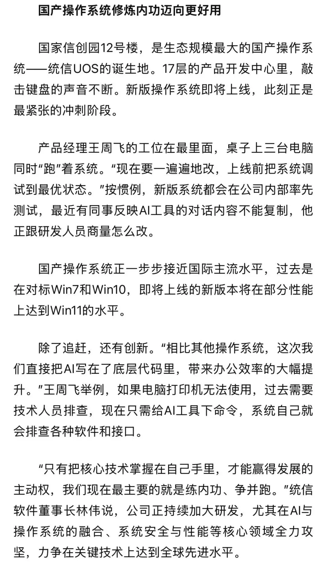 近日,北京日报在一篇报道中,将目光投向了位于北京经开区国家信创园的统信软件。这家生态规模最大的国产操作系统企业,正以扎实的研发攻坚和前瞻性的 AI 融合,向外界展示中国基础软件的韧性与潜力。