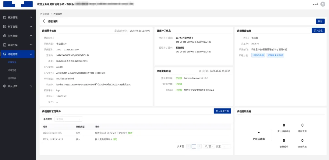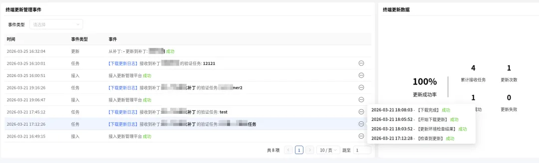 全操作日志留痕:谁发起的更新、什么时候审批的、终端安装结果如何,全程记录,留存周期满足合规要求,可追溯可核查;