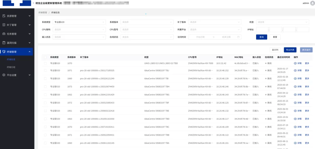 终端清单自动更新:终端硬件配置、系统版本、补丁安装历史,自动形成完整资产清单,无需手动整理,后续管理更清晰。
