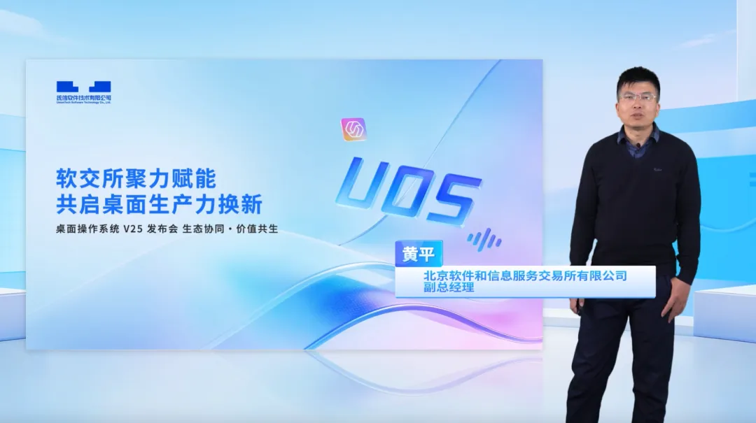 北京软件和信息服务交易所有限公司副总经理黄平分享了软交所与统信软件在国企信创落地中的探索与实践。