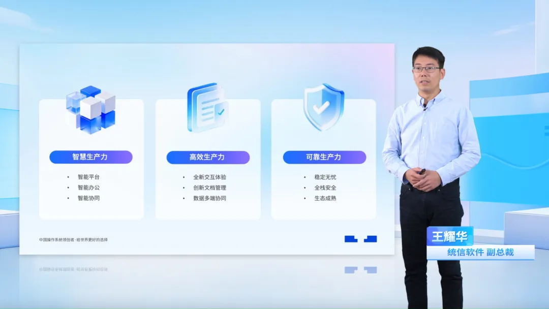 统信软件副总裁王耀华系统介绍了统信桌面操作系统 V25 在智慧、高效、可靠三大生产力维度的技术突破。