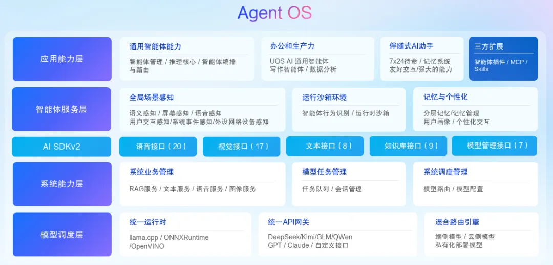 UOS AI 3.0 正式进入 Agent OS 时代,系统升级了 AI 架构,新增 AI SDK V2 版本,增加了智能体服务层。