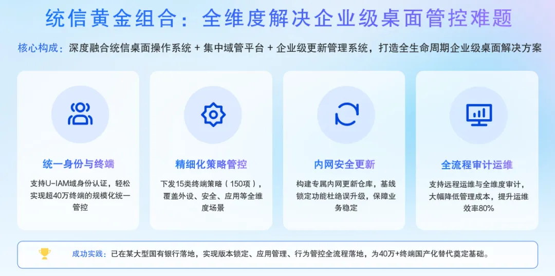 企业管控:统信软件的“黄金组合”——桌面系统+集中域管平台+更新管理系统,能统一管理超过 40 万台终端,下发 150 多项精细化策略(比如禁止 U 盘、限制软件安装)。已在某大型国有银行落地,为 40 多万台电脑的国产化替换提供了保障。