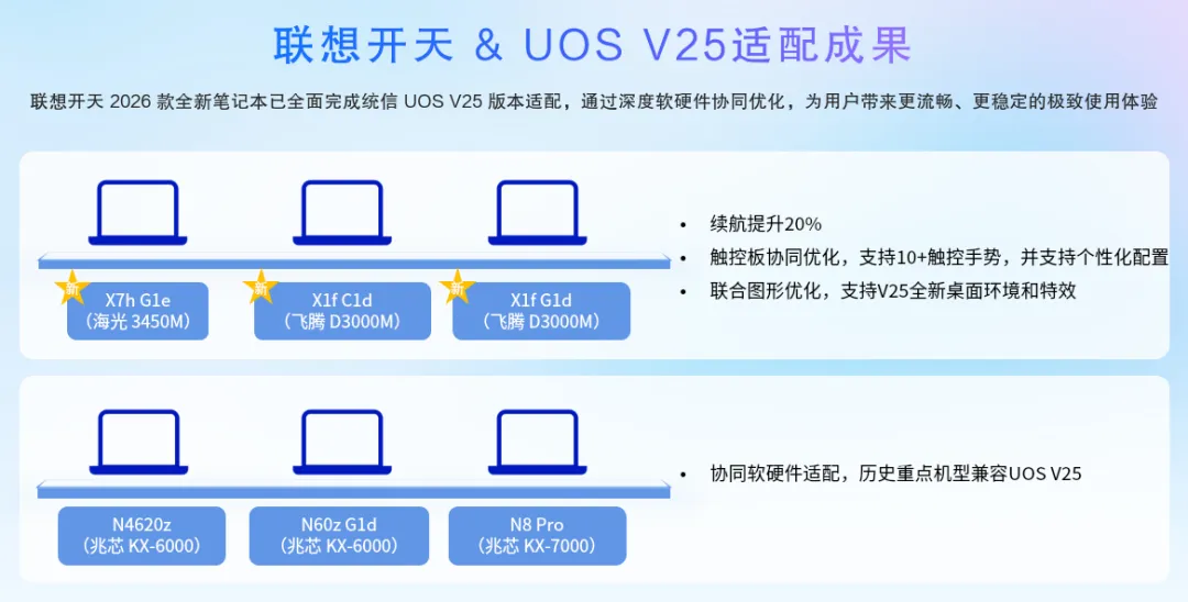 笔记本:海光四号平台的 X7 系列、飞腾 D3000 的超轻薄机型、兆芯开先 6000/7000 系列,都已经和统信桌面操作系统 V25 深度适配。特别是触控板做了协同优化,支持几十种手势,续航也有提升。