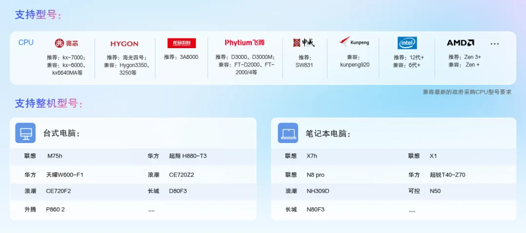 统信软件与国内主流 CPU 厂商联合优化,兼容最新的政府采购型号。同时,上一代 CPU 也持续兼容。推荐用最新型号获得最佳体验,但老用户也不被抛弃。整机方面,联想、浪潮、长城、华方等数十款台式机和笔记本都已适配。