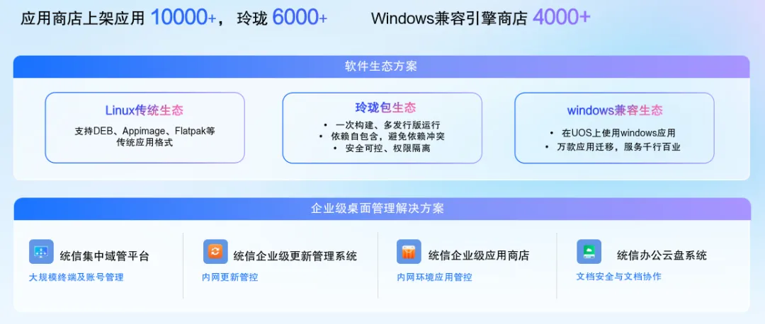 统信应用商店上架应用超过 1 万款,覆盖日常办公、创意设计、行业专业软件。同时,玲珑格式应用超过 6000 款,统信 Windows 兼容引擎商店提供超过 4000 款 Windows 应用,大量老旧的行业软件可直接运行,无需安装虚拟机。