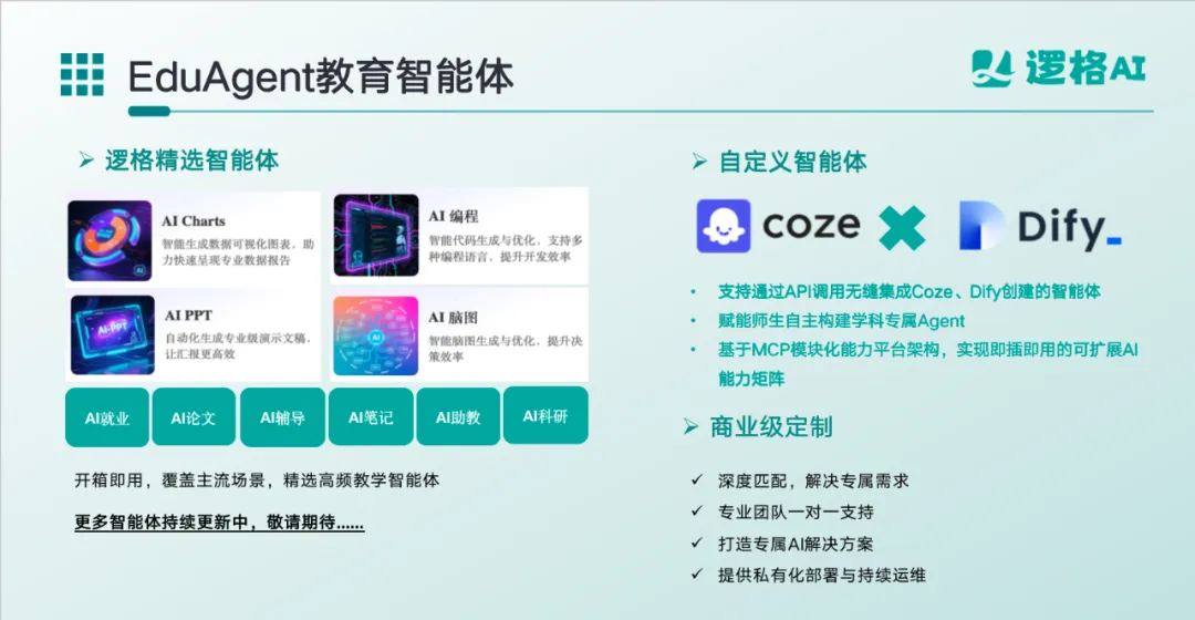 方案提供覆盖“教、学、研、管、就业”全链条的开箱即用型智能体: