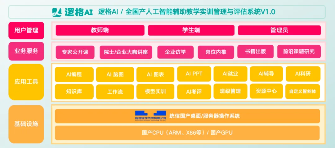 该联合解决方案以统信 UOS 为基础,深度融合逻格 AI 全国产人工智能辅助教学实训管理与评估系统 V1.0 平台,具备以下三大核心优势: